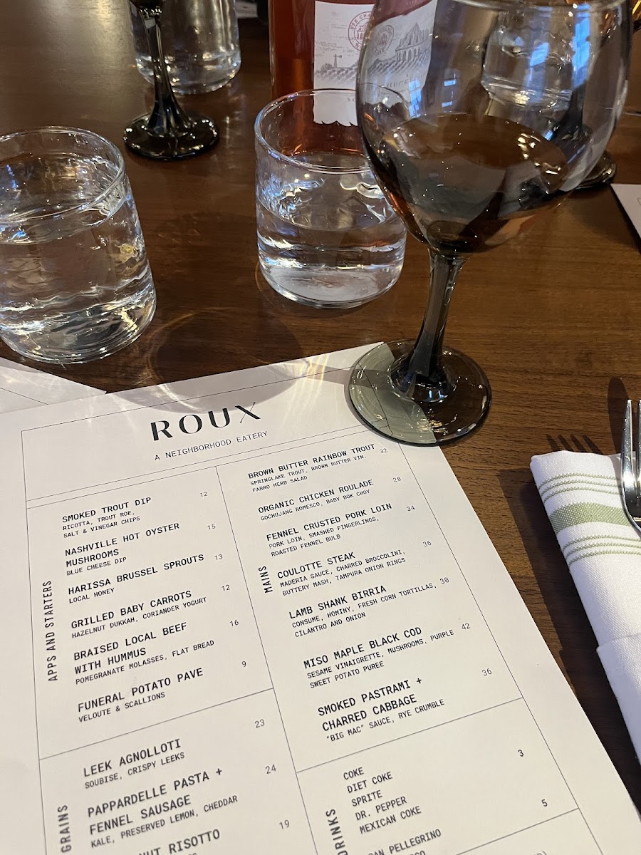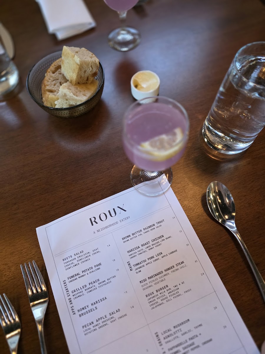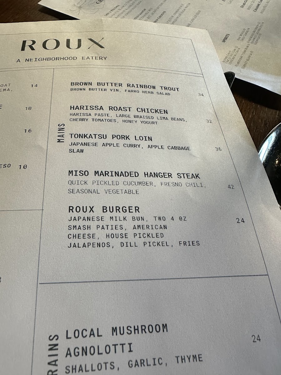 Roux Restaurant’s menu presents a thoughtful blend of American classics and fusion dishes, crafted to suit a variety of occasions throughout the day. Whether you're stopping by for a leisurely brunch featuring options like Eggs Benedict or the Roux Breakfast, or settling in for dinner with standouts such as Lamb Shank, 5 Spice Maple Chicken, or hand-made fresh pastas like Japanese Pumpkin Gnocchi, the offerings invite a relaxed yet refined dining experience.
